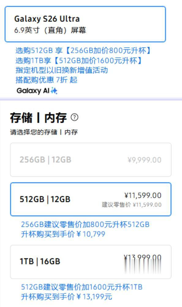作为系列顶配机型,三星S26 Ultra提供三个存储版本,12GB+256GB版本售价9999元,12GB+512GB版本售价11599元,16GB+1TB版本售价13999元。该机型同样享有升杯优惠,选购512GB版本可享“256GB加价800元升杯”,到手价为10799元;选购1TB版本可享“512GB加价1600元升杯”,到手价为13199元。
