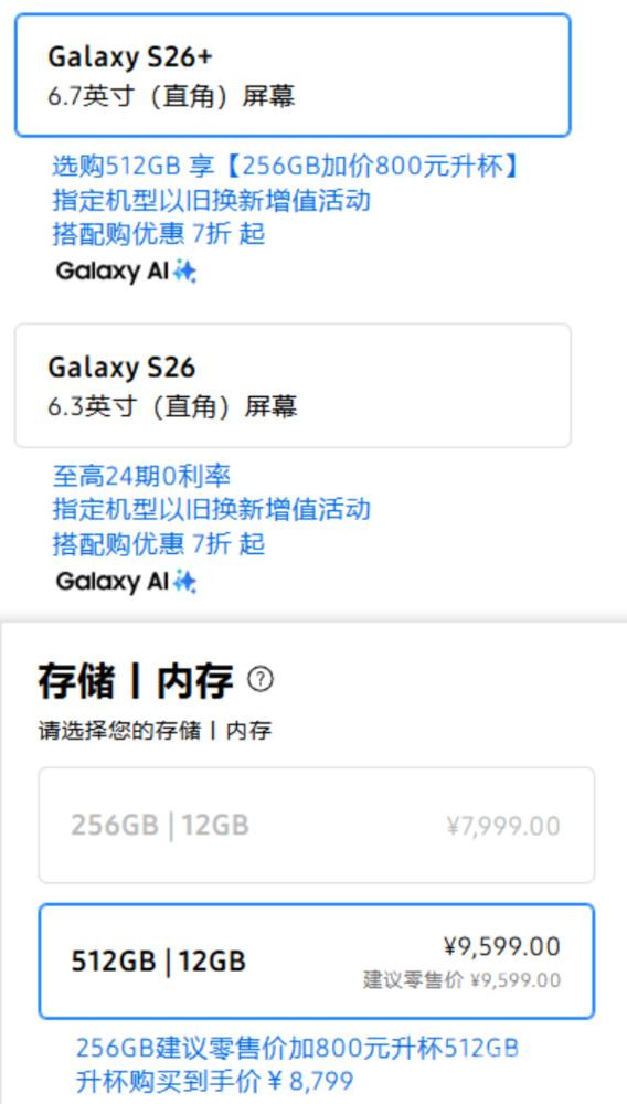 三星S26+的12GB+256GB版本售价7999元,12GB+512GB版本售价9599元。为提升用户体验,三星推出升杯优惠,用户选购512GB版本时,可通过“256GB加价800元升杯”的方式,以8799元的到手价购入。